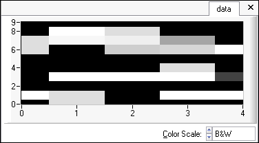 A graph for a 2D array is an intensity plot. The different shades of gray represent the magnitude of the points. Darker shades represent lower values, and lighter shades represent higher values. The color scale uses the standard spectrum. The following colors are organized from highest value to lowest value.