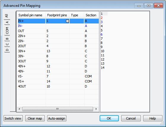 Switch view—Changes the view so that the symbol pins appear in the preview, and any tabs appear on the right of the dialog box. Clear map—Unmaps all of the mapped pins. Auto-assign—Assigns symbol pins to Package pins in the order in which the Symbol pin names appear. |