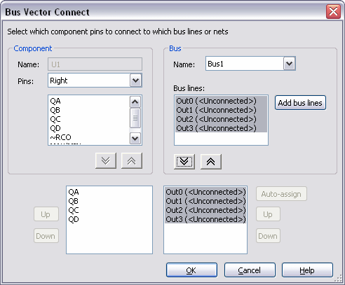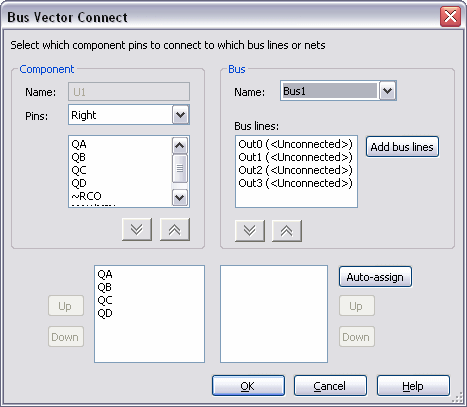 If the Bus lines field is empty, you can click on the Auto-assign button to automatically create and assign bus line names that correspond to the pin names. You can also add new bus lines by clicking Add bus lines.