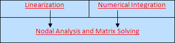 There are three core processes which enable the simulator to solve analog circuits: Nodal Analysis and Matrix Solving, Linearization, and Numerical Integration. Nodal Analysis and Matrix Solving is the most fundamental process and forms the basis for the Linearization and Numerical Integration processes.