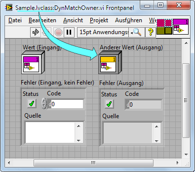 Dieses LabVIEW-Klassenbedien- oder -anzeigeelement ist mit dem VI-Anschlussfeld verbunden und arbeitet dynamisch. Alle dynamischen Anschlüsse müssen den gleichen Datentyp wie die Klasse haben, zu der das VI gehört. Dieses Bedien- oder Anzeigeelement hat einen anderen Typ.