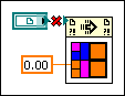 In diesem Beispiel stimmt die strikt typisierte VI-Referenz am Frontpanel nicht mit dem Verbindungsmuster überein, das vom Knoten zum Aufruf über Referenz erwartet wird. Da aber der Aufruf über Referenz bereits verbunden ist, kann er nicht an den Typ der Frontpanel-Referenz angepasst werden.