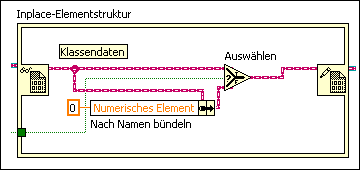 Eine Auswählen-Funktion liegt zwischen einem Rahmenknotenpaar Datenwertreferenz lesen / schreiben einer Klassenreferenz. An den Klasseneingängen t und f dieser Funktion muss eine Variation der ursprünglichen Klassendaten anliegen. Entweder stammen die Klassendaten an einem der Eingänge dieser Funktion von einer anderen Datenquelle oder die Daten durchlaufen eine Funktion, bei der sich der Datentyp während der Ausführung ändern kann.