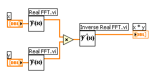 Auf diese Weise wird eine lineare Faltung, keine zirkuläre erzielt. Da jedoch x(t) * y(t)N ⇔ X(f)Y(f) ein Fourier-Transformationspaar ist, wobei x(t) * y(t)N die zirkuläre Faltung von x(t) und y(t) ist, können Sie eine zirkuläre Version der Faltung erstellen. Zur Berechnung der zirkulären Faltung können Sie das Blockdiagramm zum Beispiel so aufbauen, wie in der folgenden Abbildung dargestellt.