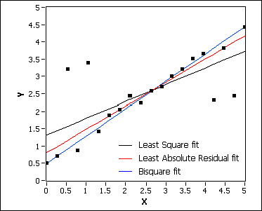 Das Verfahren des kleinsten absoluten Residuums und das Biquadrat-Verfahren sind leistungsfähige Anpassungsverfahren. Sie sollten dann angewandt werden, wenn es unter den Beobachtungswerten Ausreißer gibt. In der Abbildung werden die Ergebnisse der Verfahren "Kleinstes Quadrat", "Kleinstes absolutes Residuum" und "Biquadrat" einander gegenübergestellt. In den meisten Fällen ist das Biquadrat-Verfahren weniger für Ausreißer empfänglich als das Verfahren des kleinsten absoluten Residuums.