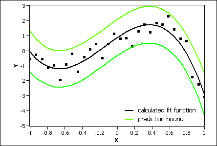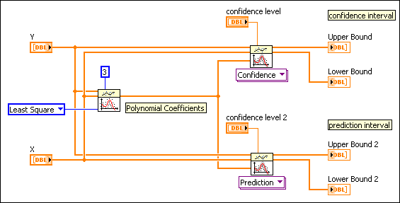 Wenn das Rauschen Y gaußverteilt ist, kann das Konfidenz- und das Prognoseintervall mit beiden Instanzen des polymorphen VIs berechnet werden. Im dargestellten Blockdiagramm werden Konfidenz- und Prognoseintervall mit dem VI "Intervalle der Polynomanpassung" berechnet. Die beobachteten Werte werden dann mit dem VI Allgemeine Polynomanpassung im Modus "Kleinstes Quadrat" angepasst, um die Polynomkoeffizienten zu ermitteln.