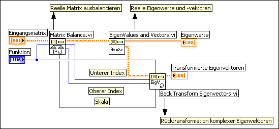 Das nachfolgende Blockdiagramm zeigt ein Beispiel für die Verwendung der VIs "Matrix ausbalancieren" und Rücktransformation von Eigenvektoren in einem VI zur Berechnung der Eigenwerte und -vektoren der Matrix A.