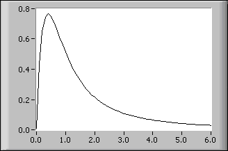 Im folgenden Diagramm sehen Sie die reelle Laplace-Transformation der Funktion f(t) = sin(t) im Intervall (0, 6). Dies wird auf der Frontplatte als Ende 6.00 und X-Werte von sin(t) für 0 ≤ t ≤ 6 eingegeben.