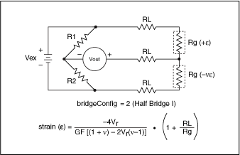 In den Schaltbild ist Uout die gemessene und zum Konvertierungs-VI als Usg übergebene Spannung. Bei Viertel- und Halbbrückenkonfigurationen sind R1 und R2 Ersatzwiderstände, die nicht direkt in die Berechnungsformel einbezogen werden.