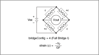 Die von diesem VI verwendete Konvertierungsformel basiert allein auf der Brückenkonfiguration. Die folgenden Abbildungen zeigen die sieben mögliche Brückenschaltungen und die dazugehörigen Formeln. Ur wird bei allen Brückenschaltungen anhand folgender Formeln berechnet: