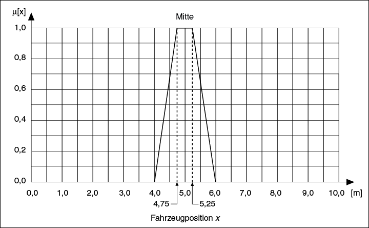 Es kann vorkommen, dass eine linguistische Variable innerhalb eines linguistischen Terms eine volle Zugehörigkeit zu einem Wertebereich aufweist, statt nur zu einem Punkt. Wenn beispielsweise die linguistische Variable Fahrzeugposition x eine volle Zugehörigkeit zum linguistischen Term x = 5 ± 0,25 m aufweist, handelt es sich um eine trapezförmige Zugehörigkeitsfunktion, wie in der folgenden Abbildung zu sehen ist.