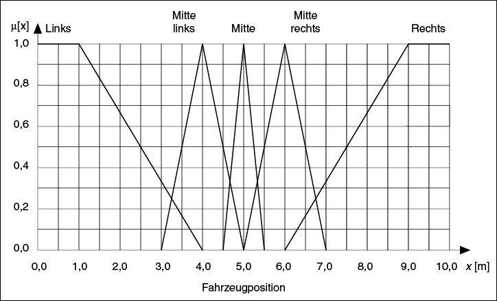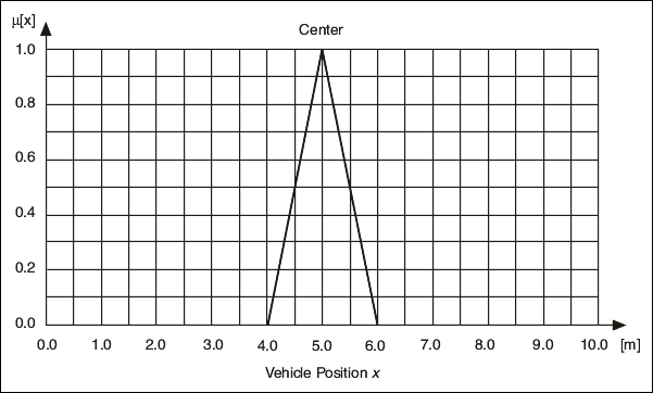 Die linguistische Variable Fahrzeugposition x kann eine volle Zugehörigkeit (1) zum linguistischen Term Mitte bei 5 Metern haben, keine Zugehörigkeit (0) innerhalb des Terms bei 4 Metern oder weniger oder bei 6 Metern oder mehr, und eine teilweise Zugehörigkeit bei allen Entfernungen zwischen 4 und 6 Metern. Beim Darstellen des Zugehörigkeitsgrads gegenüber der Fahrzeugposition x ergibt sich als resultierende Zugehörigkeitsfunktion eine Dreiecksfunktion.