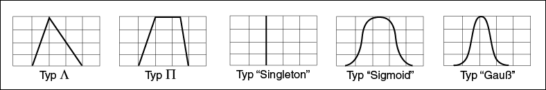 Sie können die in der folgenden Abbildung gezeigten normalisierten Standardfunktionen für die meisten technischen Prozesse verwenden. Diese Standardfunktionen umfassen die Zugehörigkeitsfunktionen Λ (Dreiecksform), Π (Trapezform), Singleton (vertikale Linienform), Sigmoid (Wellenform) und Gauß (Glockenform).