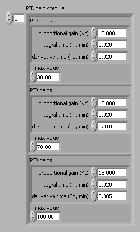 Der Eingang PID-Gain-Schedule des VIs PID-Gain-Schedule ist ein Array aus Clustern aus PID-Verstärkungswerten und entsprechenden Höchstwerten. Jeder Satz von PID-Verstärkungswerten entspricht dem Bereich von Eingangswerten von Max. Wert des vorhergehenden Elements des Arrays bis zum Max. Wert desselben Elements im Array. Der Eingangsbereich der PID-Verstärkungswerte des ersten Elements von PID-Gain-Schedule ist alle Werte kleiner oder gleich dem entsprechenden Max. Wert.