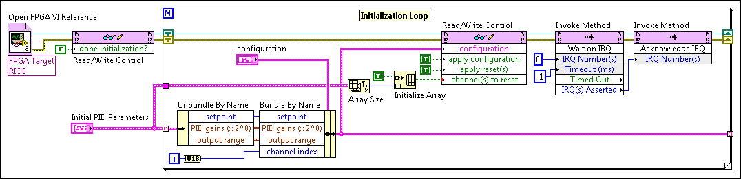 Die in das Konfigurationsdialogfeld des Express-VIs "PID (FPGA)" eingegebenen Anfangswerte gelten für alle Kanäle. Zum Festlegen unterschiedlicher Werte für die einzelnen Kanäle muss eine Initialisierungsschleife im Host-VI erstellt werden.