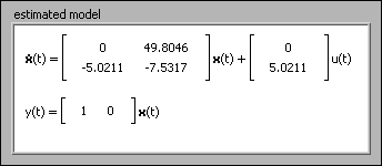 The SI Estimate Partially Known State-Space Model VI estimates each parameter of the model. You obtain the estimated model and optimized variables of the model after this VI performs an optimization. In this example, you obtain the values 0.20 H for L and 0.02 F for C, as shown in the following figure.