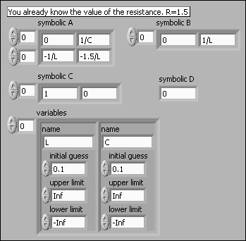 You specify the symbolic state-space model using formula strings, such as 1/C, -1/L, and -1.5/L, with L and C as variables. Then you define L and C with the variables input, as shown in the following figure. Using prior knowledge, you know that L is a positive value around the initial value of 0.1 H, and C is a value between 0 F and 0.3 F.