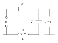 The following figure shows an RLC circuit, where u is the input voltage, y is the output voltage, iL is the current, and uC is the capacitor voltage. In this example, y equals the capacitor voltage uC.