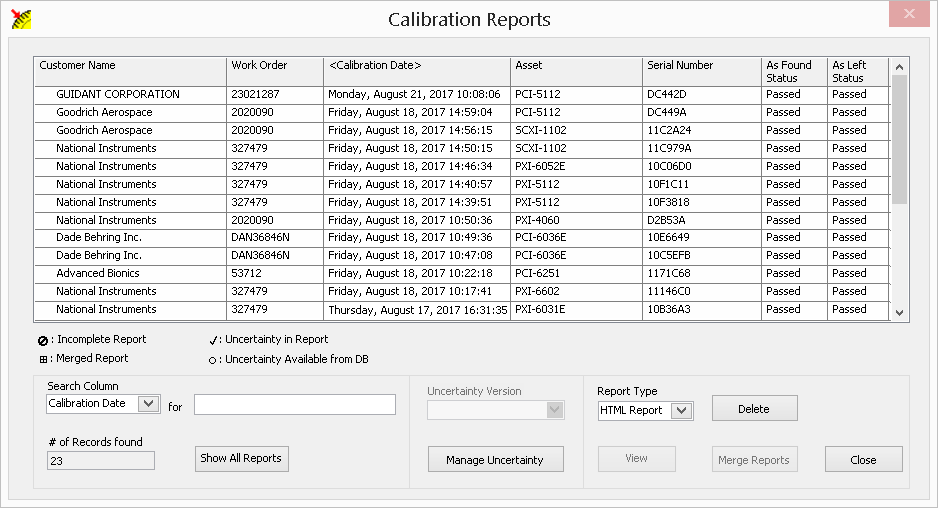 - Click Close to close the Calibration Reports window and return to the main Calibration Executive user interface.