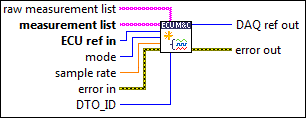 Mode=0 DAQ List: The data is transmitted from the ECU in equidistant time intervals as defined in the A2L database. The data can be read back with the MC DAQ Read.vi as Single point data using a sample rate = 0 or as waveform using a sample rate > 0. Input channel data are received from the DAQ messages. Use MC DAQ Read.vi to obtain input samples as single-point, array, or waveform. Mode=1 Polling: In this mode the data from the Measurement task are acquired from the ECU whenever the MC DAQ Read.vi is called. Mode=2 STIM List: In this mode the data from the Measurement task are send to the ECU whenever MC DAQ Write.vi is called. Mode=3 Timestamped read: The data is transmitted from the ECU in equidistant time intervals as defined in the A2L database. The data can be read back with MC DAQ Read.vi as timestamped data array. Input channel data are received from the DAQ messages. Use MC DAQ Read.vi to obtain input samples as an array of sample/timestamp pairs (Poly VI types 2D Double time stamped and Time-Value XY Array). Use this input mode to read samples with timestamps that indicate when each channel is received from the network. |