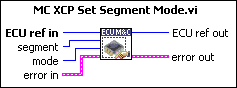 MC XCP Set Segment Mode.vi implements the XCP command SET_SEGMENT_MODE and sets the selected segment into the specified mode. If Mode=0 the segment disables the FREEZE mode, if Mode=1 the segment is set to FREEZE mode through an XCP STORE_CAL_REQ operation.