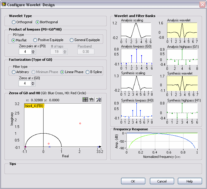 (G0) to 4 because the wavelet must be near-orthogonal, meaning that G0(z) and H0(z) have the same or almost the same amount of zeros. By setting the value of Zeros at