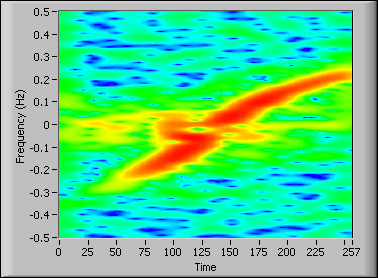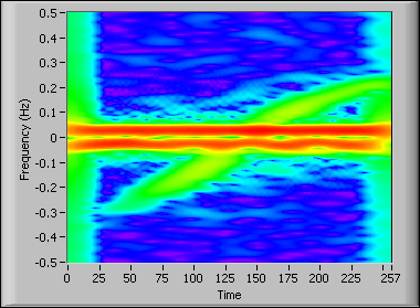 The color corresponds to the magnitude of the STFT coefficients. The color spectrum from red to blue corresponds to the magnitude from maximum to minimum. The red stripes close to 0 Hz are the sea clutter interference. The green stripe running diagonally across the interference signal is the target signature signal. Notice that the interference signal is stronger than the target signature signal and that the interference and the target signature overlap in the time-frequency plane. A conventional time-domain fixed filter is not sufficient for separating these components. Because the spectral peak of the target signature changes over time and the spectral bandwidths of the interference vary over time, you can use the TFA Adaptive Transform VI to decompose the signal into a linear combination of chirplets. Next, you can remove the resulting chirplets with a chirp rate close to zero and a frequency less than 0.02 Hz in this example. Then you can use the TFA Adaptive Expansion VI to reconstruct the target signature, as shown in the following figure.