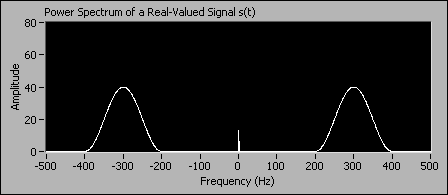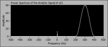 Notice that the power spectrum of the real-valued signal is symmetric about 0 Hz. In comparison, the power spectrum of the analytic signal is not symmetric and contains components with positive frequency only. Furthermore, the amplitude of the power spectrum of the analytic signal with positive frequency is twice the amplitude of the power spectrum of the real-valued signal. Whereas the amplitude of the power spectrum of the real-valued signal is 40 at 300 Hz, the amplitude of the power spectrum of the corresponding analytic signal is 80 at 300 Hz.