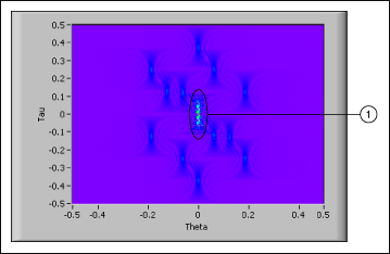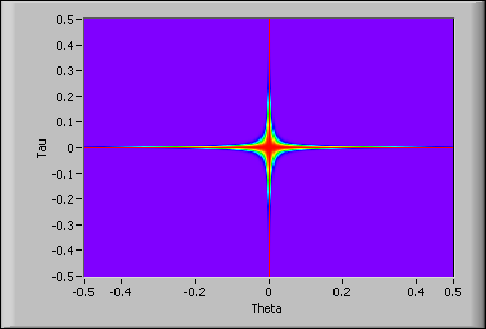 In the previous figure, the components located at the origin of the ambiguity function plane are associated with the auto-terms of the WVD. All the auto-terms overlap at the origin of the ambiguity function plane. The components located away from the origin of the ambiguity function plane correspond to the cross-terms of the WVD. Because the auto-terms and the cross-terms are separated in the ambiguity function plane, you can apply a mask function, also called a kernel function, to keep the auto-terms and remove the cross-terms. The kernel function determines how to suppress the cross-terms. By selecting the appropriate kernel function, you can reduce the cross-term interference and keep some useful properties of the WVD, such as accurate marginal time integration, marginal frequency integration, mean instantaneous frequency, and group delay. Lastly, you can apply the 2D Fourier transform to the ambiguity function to obtain the smooth WVD, also called the Cohen's class time-frequency representation.