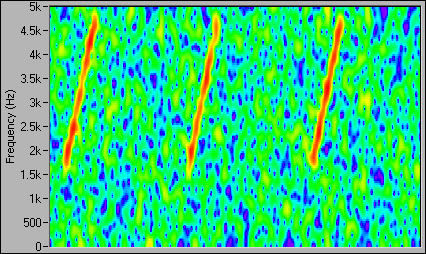 The color corresponds to the magnitude of the Gabor coefficients from the discrete Gabor transform. The color spectrum from red to blue corresponds to the magnitude from maximum to minimum. The Gabor coefficients that correspond to the chirps have a higher magnitude and are concentrated in a relatively small region in the time-frequency domain. The Gabor coefficients that correspond to the noise have a lower magnitude and are spread over the entire time-frequency domain. By applying a thresholding operation, you can preserve the Gabor coefficients that correspond to the chirps and reduce to zero the Gabor coefficients that correspond to noise. The Time Varying Filter (Thresholding) Express VI reconstructs the denoised chirps from these modified Gabor coefficients by using the discrete Gabor expansion, as shown in the following figure.
