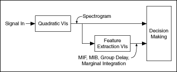 You can use the Time Frequency Analysis VIs to compute the spectrogram of a signal, analyze the spectrogram directly, and then decide what step to take next. You also can use the spectrogram to compute other indexes, such as the MIF, the mean instantaneous bandwidth (MIB), the group delay, and the marginal integration before deciding what step to take next.