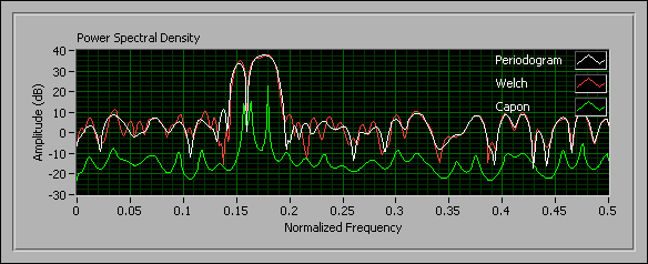 Use the TSA Capon Spectrum VI to compute the PSD of a time series by using the Capon method. Use the TSA Capon Frequency Estimator VI to determine the leading frequency of a time series by using the Capon method.