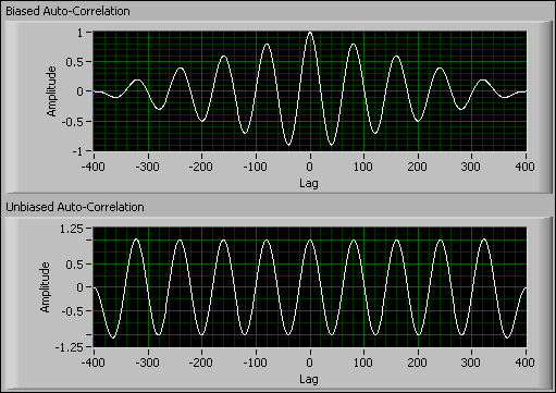 When performing auto-correlation of a time series, you can choose either biased or unbiased weighting. Biased weighting is helpful when you perform spectral analysis with the Fourier transform, because biased weighting can reduce spectral leakage, bias, and variance in the resulting power spectrum. Unbiased weighting is suitable for periodicity detection in the time domain. If you use unbiased weighting, the amplitudes of the auto-correlation values do not decrease as the lag increases.