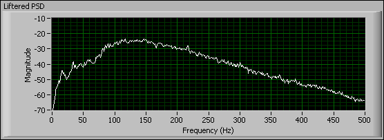 You can modify, or lifter, the power cepstrum and then transform it back to the PSD. The word lifter is an anagram of the word filter, formed by reversing the first three letters. By liftering the unnecessary harmonic peak families, you can remove an individual peak family from the PSD. The following figure shows the PSD of the gearbox vibration signal after you lifter all the harmonic peak families. Notice that the harmonic peaks in the liftered PSD have disappeared.
