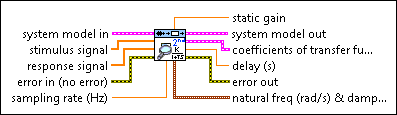 Estimates a continuous transfer function model for a partially known system. Use the SI Create Partially Known Continuous Transfer Function Model VI to create the model you want to estimate. You must manually select the polymorphic instance to use.