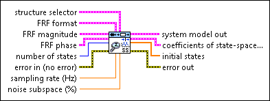 You can obtain the FRF of a dynamic system by using the SI Estimate FRF VI. You can wire the FRF magnitude and FRF phase outputs of the SI Estimate FRF VI to the FRF magnitude and FRF phase inputs of the SI Estimate State-Space Model from FRF VI.
