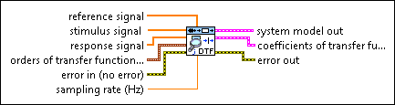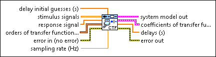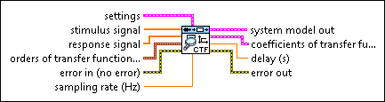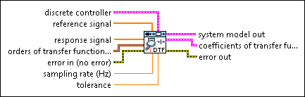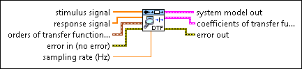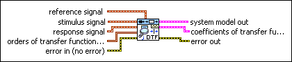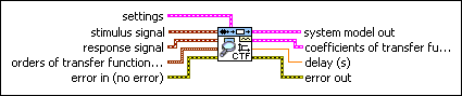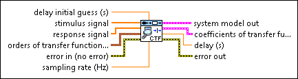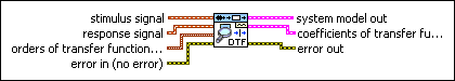 Estimates the parameters of a continuous or discrete transfer function model for an unknown system. This VI estimates only the transfer function between the stimulus and the response. The transfer function between the noise and the response is assumed to be 1. You must manually select the polymorphic instance to use.