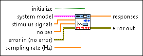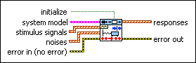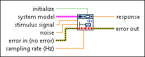 Simulates the point-by-point response of a system model to an input signal. Wire data to the stimulus signal and noise inputs to determine the polymorphic instance to use or manually select the instance.