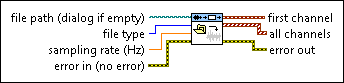 first channel returns the data from the first waveform in the record if the file type is Waveforms Data File. If the file type is Spreadsheet Text File, this VI converts the data array to a waveform based on the sampling rate you provide. |