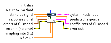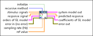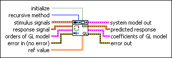 Estimates the parameters of a general-linear (GL) model using a recursive method. Wire data to the stimulus signal and response signal inputs to determine the polymorphic instance to use or manually select the instance.