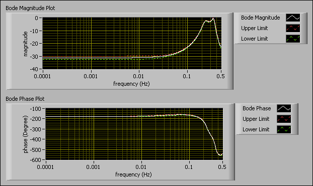 The SI Bode Plot VI calculates the upper and lower limits according to the confidence level you set. You can obtain information, such as the gain of the system and the cutoff frequency, by evaluating the Bode plot. You can display the Bode magnitude and phase using the SI Bode Plot Indicator.