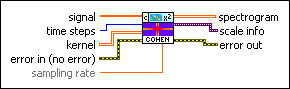 Computes the Cohen's class time-frequency distribution of signal. kernel controls the properties of the resulting spectrogram. Wire data to the signal input to determine the polymorphic instance to use or manually select the instance.