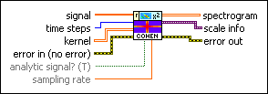 time steps specifies the sampling period, in samples, along the time axis in the joint time-frequency domain. The default is –1, which specifies that this VI adjusts time steps automatically so that no more than 512 rows exist in spectrogram. The number of rows in spectrogram equals the signal length divided by time steps. If you specify a small value for time steps, this VI might return a large spectrogram, which requires a long computation time and more memory. National Instruments recommends that you set time steps so that the number of rows in spectrogram does not exceed 512. If you need a small sampling period to observe more details and the signal length is large, divide the signal into smaller segments and compute the spectrogram for each segment or downsample the signal if it is oversampled. The scale info output contains the actual sampling period in seconds along the time axis. |