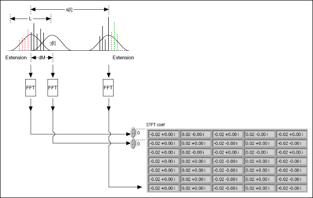 The short-time Fourier transform (STFT) is the simplest method to use to analyze a time-varying signal or nonstationary signal whose frequency component varies over time. To compute the STFT of an entire signal, this VI uses a sliding window to divide the signal into several blocks and then applies the fast Fourier transform (FFT) to each data block to obtain the frequency contents. You can overlap the sliding window. The following illustration shows the computing procedure of the STFT: