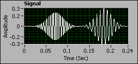 The following illustration shows a signal composed of two sine waves with a Gaussian window envelope. The frequency of the first sine wave is 250 Hz. The frequency of the second sine wave is 125 Hz. The time centers of the first and second sine wave are 0.075 s and 0.18 s, respectively.