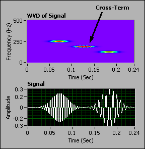 However, signal components with a different central time or central frequency generate cross-term interference in the WVD. The cross-term interference reduces the readability of the time-frequency representation. Because real-valued signals have symmetric positive and negative frequency components, cross-term interference exists between the positive frequency components and the negative frequency components in the WVD of real-valued signals. If you convert real-valued signals into analytic signals, this VI suppresses the cross-term interference between the positive frequency components and the negative frequency components because analytic signals have only the positive frequency components of real-valued signals.