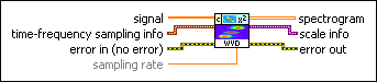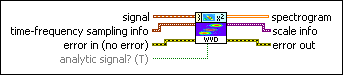 scale info returns the time scale and the frequency scale information of the time-frequency representation, including the time offset, the time interval between every two contiguous rows, the frequency offset, and the frequency interval between every two contiguous columns of spectrogram. Use the TFA Get Time and Freq Scale Info VI to return detailed information about the time scale and the frequency scale. | ||||