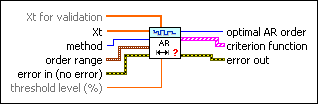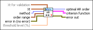 Estimates the optimal order for the autoregressive (AR) model of a univariate time series. Wire data to the Xt input to determine the polymorphic instance to use or manually select the instance.
