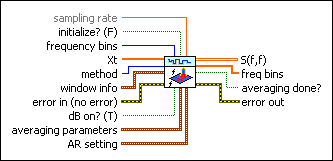 dB on? specifies whether this VI returns the S(f,f) in decibels or in a linear scale. If dB on? is TRUE, this VI returns the S(f,f) in decibels. If dB on? is FALSE, this VI returns the S(f,f) in a linear scale. The default is TRUE. | ||||||||||||||||||