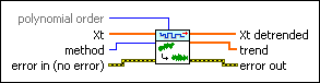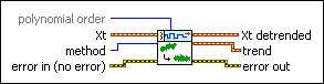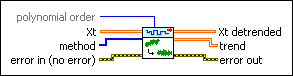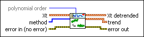 Removes the trend from a univariate or multivariate (vector) time series. This VI estimates the trend with curve-fitting methods. Wire data to the Xt input to determine the polymorphic instance to use or manually select the instance.